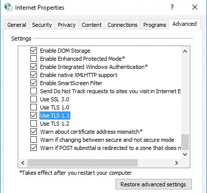 2) Please make sure the TLS protocol (secure communications) is enabled in your system.