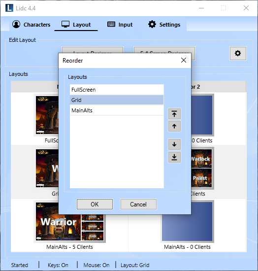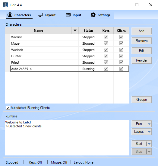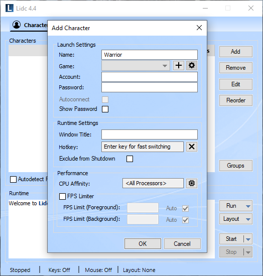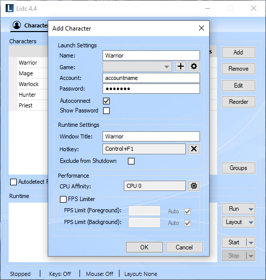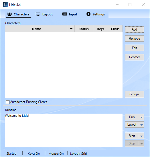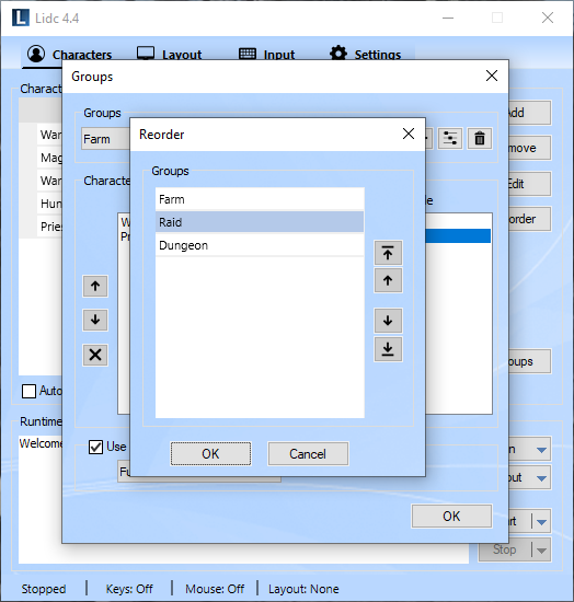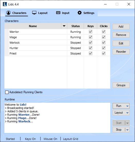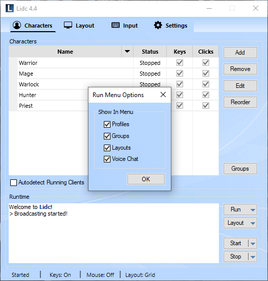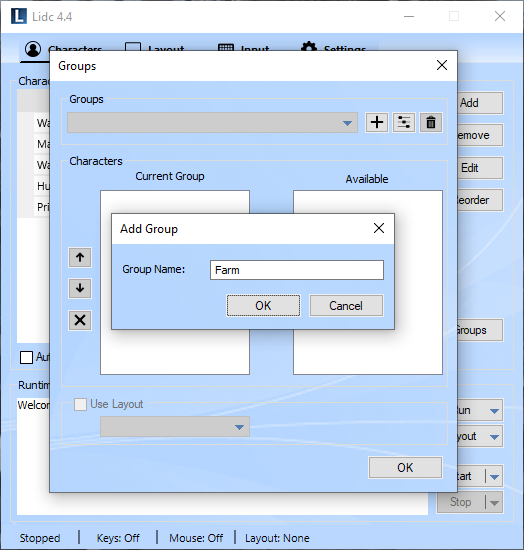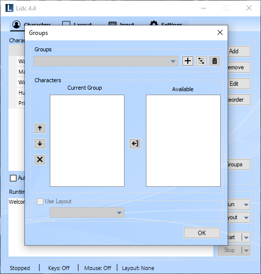 Use this feature to create groups for your characters. Any groups you create will appear in the Run menu allowing you to launch all included characters easily with one click. You may also assign a layout for your groups which will then be applied automatically upon launching.