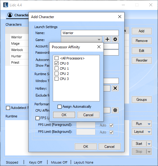 Choose which CPU cores this client is allowed to run on. Spread your characters among your available CPU cores to improve performance. Check the Assign Automatically option to have LIdc assign automatically the CPU core with the least load every time you launch a new client.