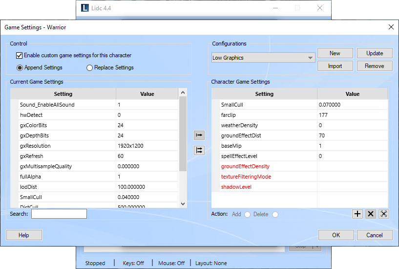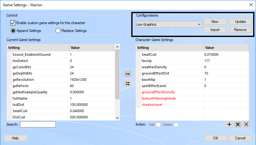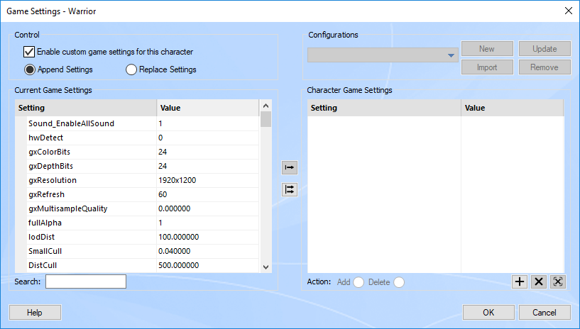 The settings you see on the Current Game Settings list, along with their respective values, are the settings that are currently defined in the game's configuration files. The list on the right side is where we will add the settings we wish to change for this individual character. Check the enable custom game settings checkbox to enable this feature for this character.