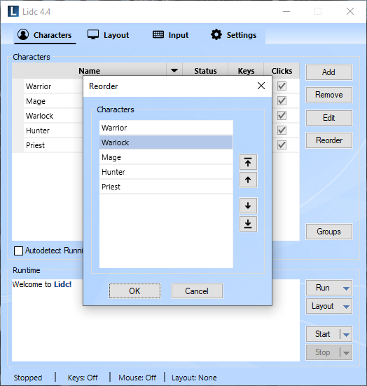 You may reorder your characters by selecting a character in the group and using the up and down arrows to change its position in the list. This is the order in which your characters will be launched when launching this group using the Run menu in the Characters Page.