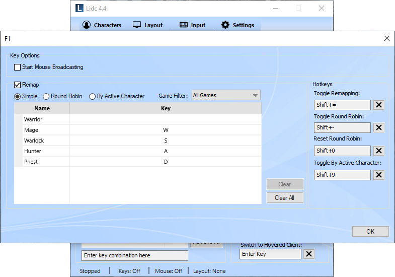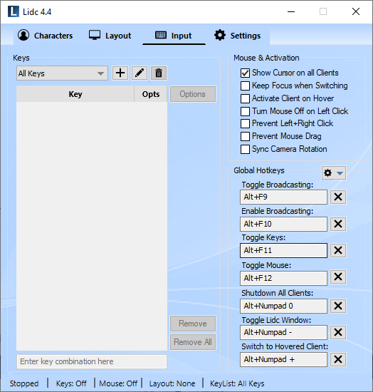In some cases, a particular character ability, may require you to point to a target area within the game by moving your mouse to the desired location and clicking. For such ability, you will require that the cursor moves concurrently for all your characters and that all your characters can click at the same time to that location. To do this with Lidc, you need to turn mouse broadcasting on which also broadcasts mouse movement and make sure you have added Left Click in your Keys list under the Input page.
