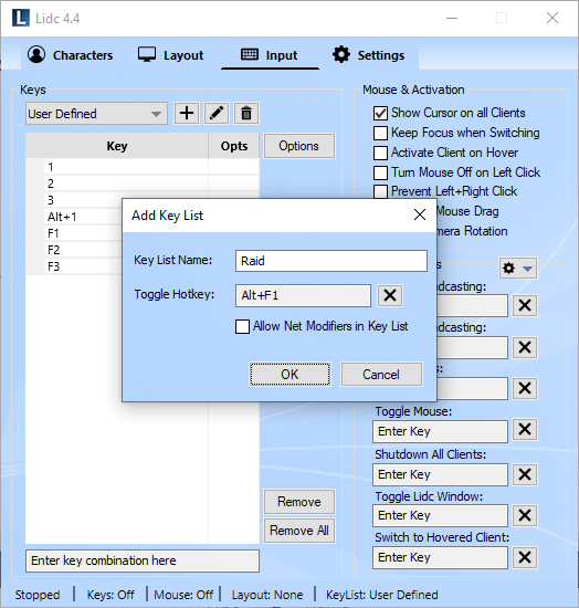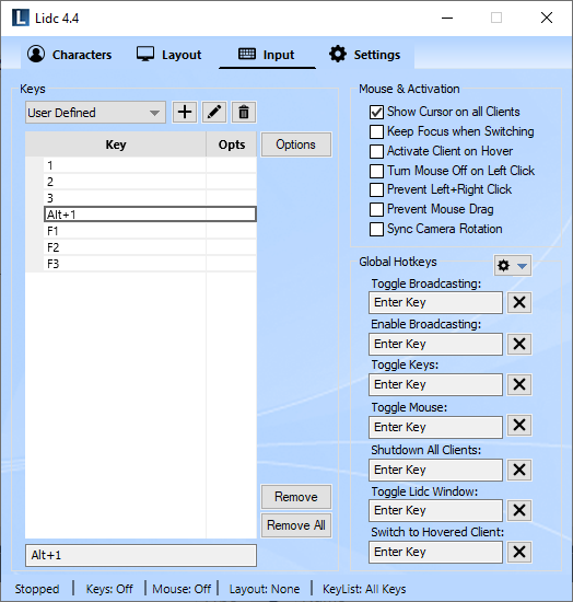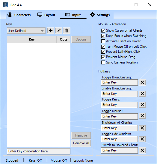 The first time you run Lidc, the predefined key list called "All Keys" will be pre-selected for you, which means that all keyboard and mouse keys will be broadcast to all clients. To define your own set of keys, click on the key lists drop down list at the top and select the "User Defined" key list. Click inside the input box