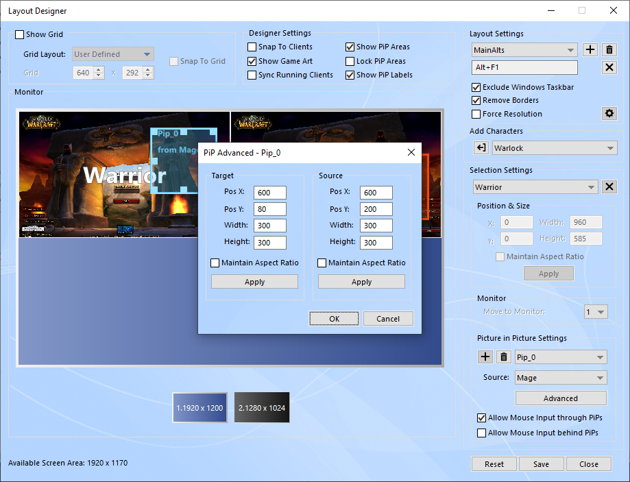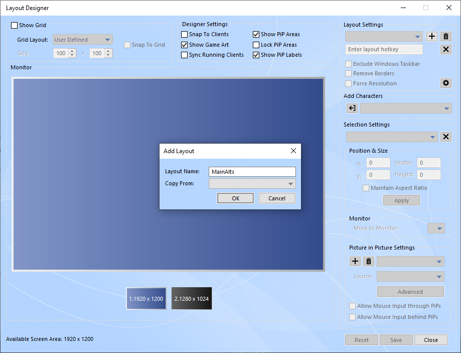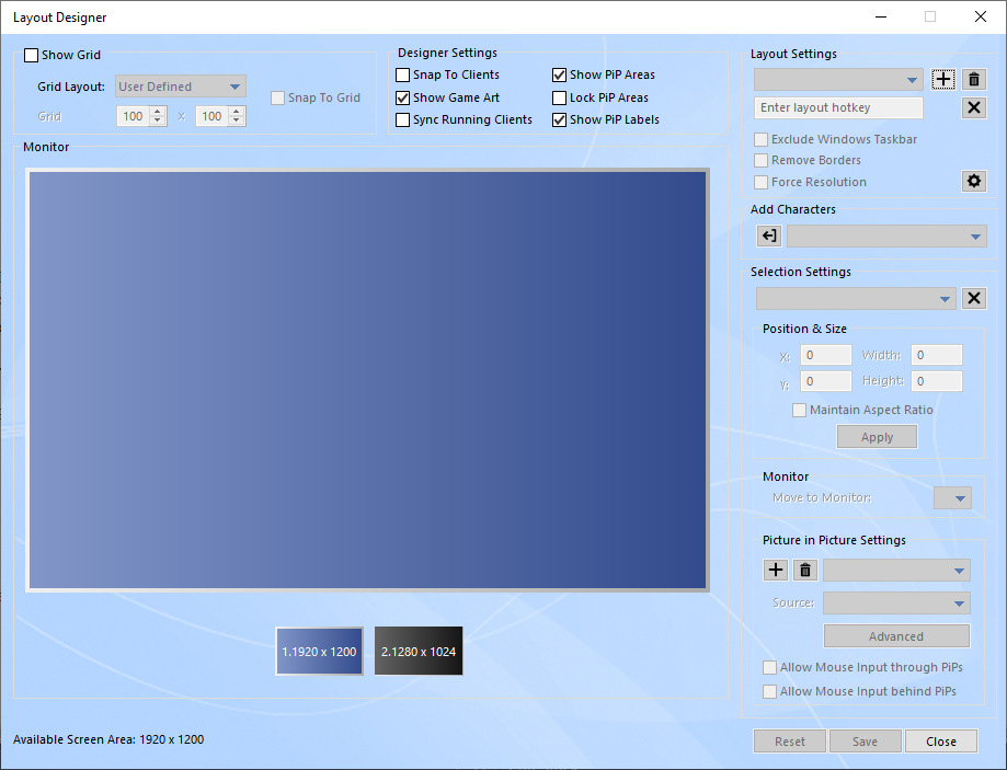 The selection settings include a dropdown list of all characters included in this layout and numeric fields that represent the client's position on the screen as well as numeric fields representing the client's width and height. You may select any character in the dropdown list and use the numeric fields to adjust its position and size more accurately.
