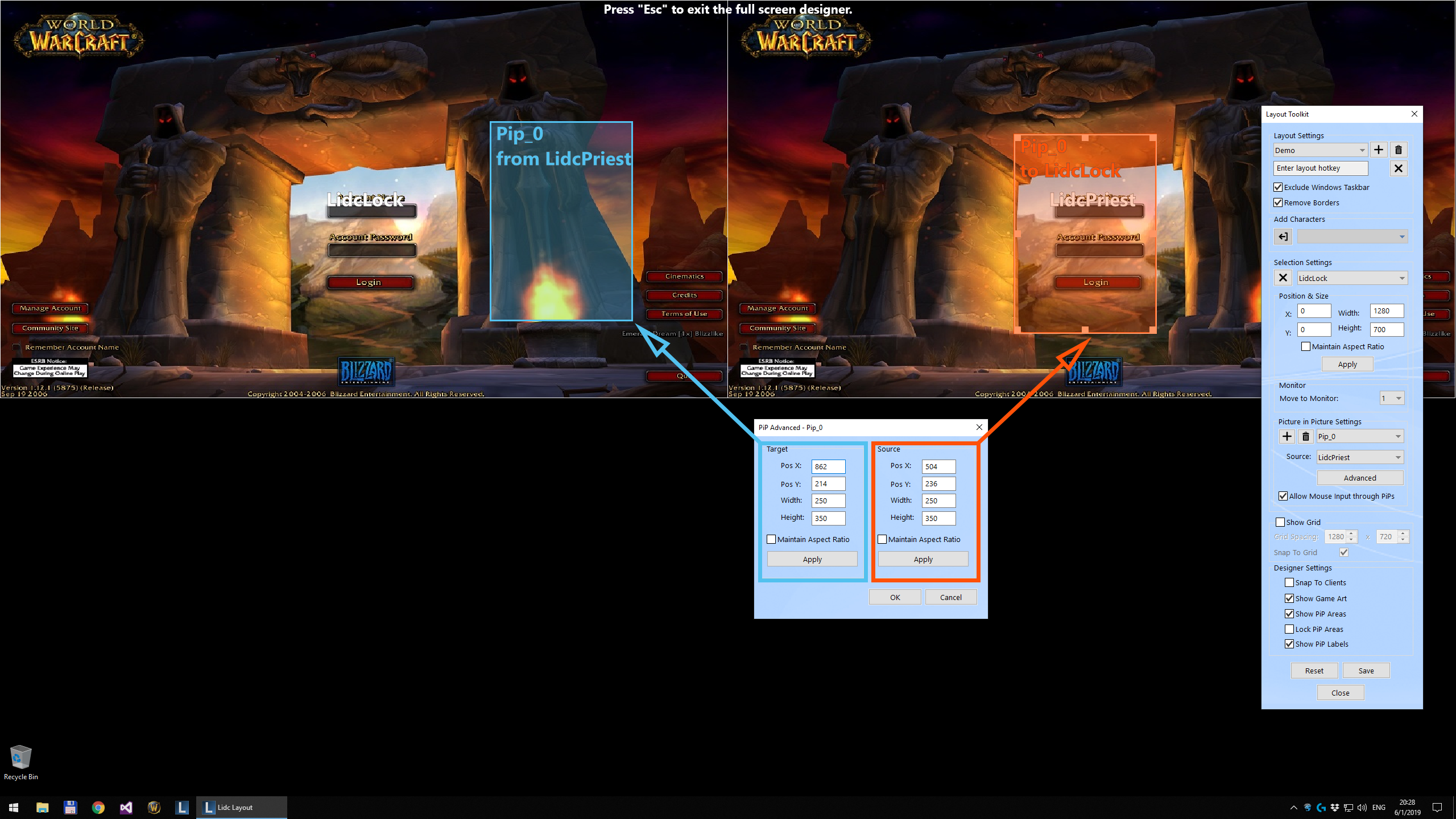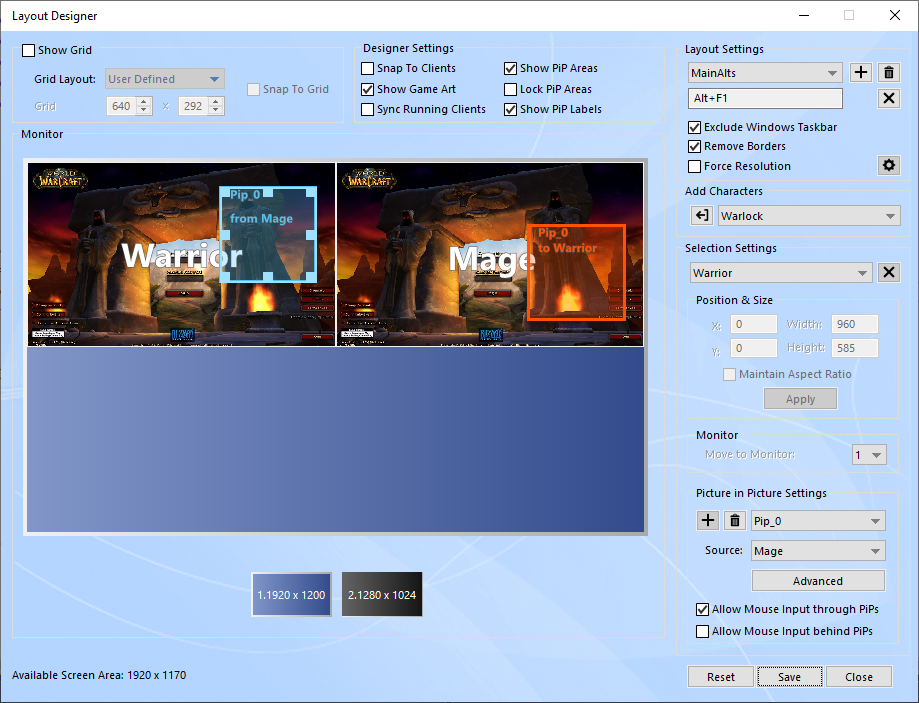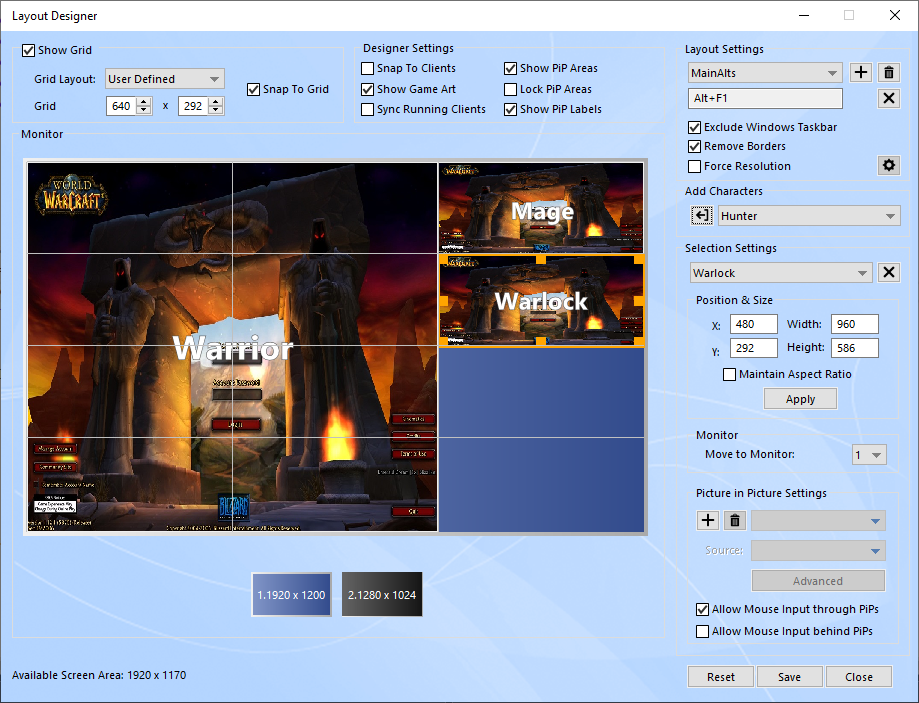 Use the Edit in Full Screen feature to create or modify a layout directly on your screen and view your clients at their real size while designing your layout. Any already running characters will use their live client window instead of the game preview image allowing you to transform your characters in real time.