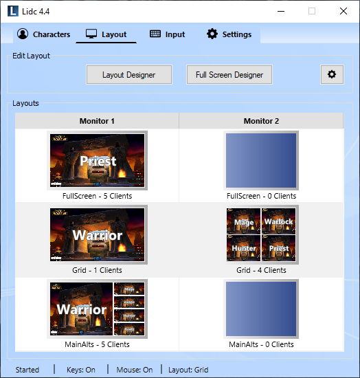 While key and mouse broadcasting is the minimum functionality you will require to sucessfully multibox a team of characters, you will find that Lidc also offers a rich variety of features that will prove very useful in managing and controlling your team. These features include a launcher that can automatically fill in your account information, a layout designer to allow you to easily position your character's game windows on your screen and many hotkeys so that you can control Lidc right from within the game window ensuring uninterrupted and smooth playing experience.