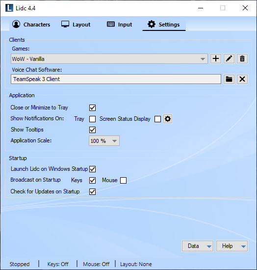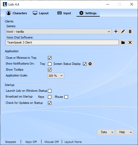 The data menu offers the ability to backup and restore all your data including your Characters, Groups, Layouts, Keys and Hotkeys. Use this functionality to create backups for safekeeping and to transfer your data in case you wish to play on another computer.