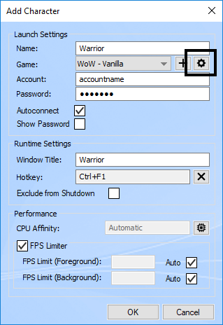 If the selected game is supported, the game settings icon (...) will be enabled. You may then use this feature to specify individual in-game settings for your character like low or high graphics settings. Please refer to our