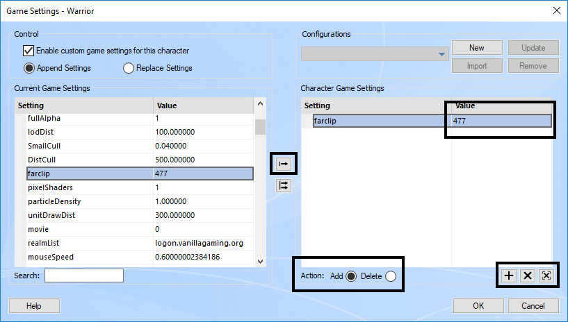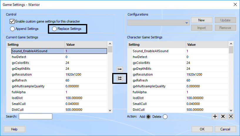 - Select the setting you wish to change in the Current Game Settings list and click on the Add Setting arrow (or double click) to add it in the Character Game Settings.