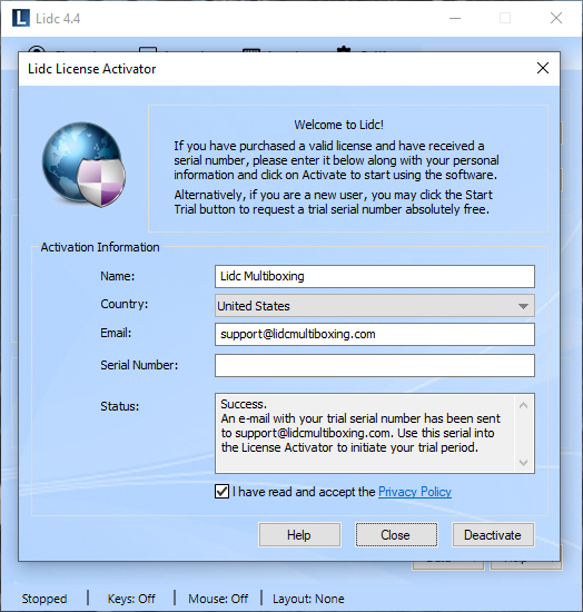You will then see a confirmation dialog to verify that you wish for a trial serial number to be sent to the email address you provided. Click Yes and check your inbox (and junk folder) for an email from Lidc Multiboxing that should include your own trial serial number for Lidc.