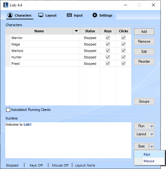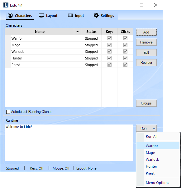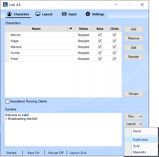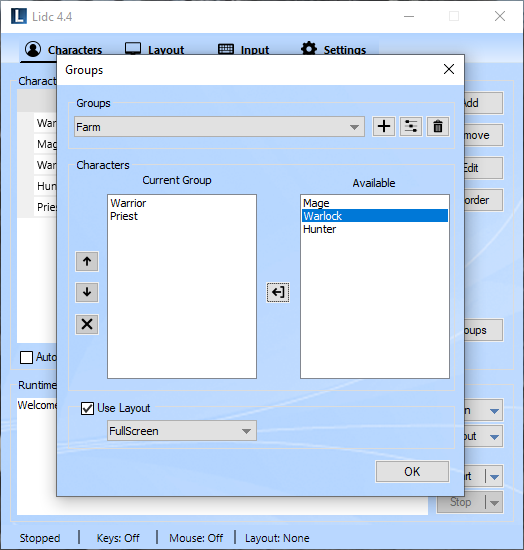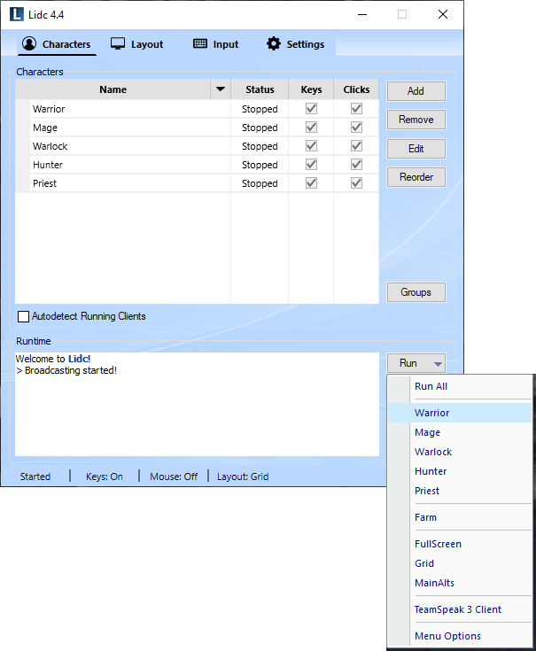 Use this feature to create groups for your characters. Any groups you create will appear in the Run menu allowing you to launch all included characters easily with one click. You may also assign a layout for your groups which will then be applied automatically upon launching.