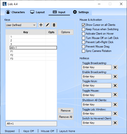 The first time you run Lidc, the predefined key list called "All Keys" will be pre-selected for you, which means that all keyboard and mouse keys will be broadcast to all clients. To define your own set of keys, click on the key lists drop down list at the top and select the "User Defined" key list. Click inside the input box