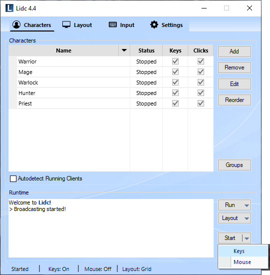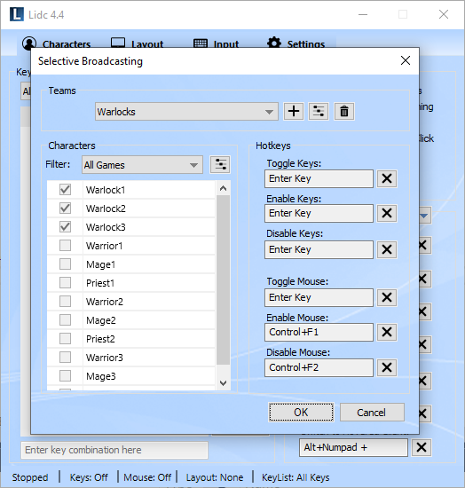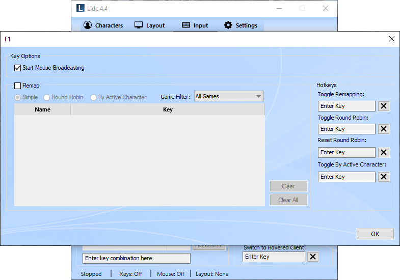 In some cases, a particular character ability, may require you to point to a target area within the game by moving your mouse to the desired location and clicking. For such ability, you will require that the cursor moves concurrently for all your characters and that all your characters can click at the same time to that location. To do this with Lidc, you need to turn mouse broadcasting on which also broadcasts mouse movement and make sure you have added Left Click in your Keys list under the Input page.