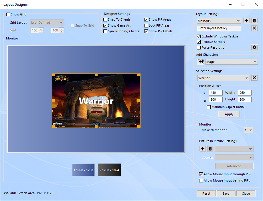 The selection settings include a dropdown list of all characters included in this layout and numeric fields that represent the client's position on the screen as well as numeric fields representing the client's width and height. You may select any character in the dropdown list and use the numeric fields to adjust its position and size more accurately.