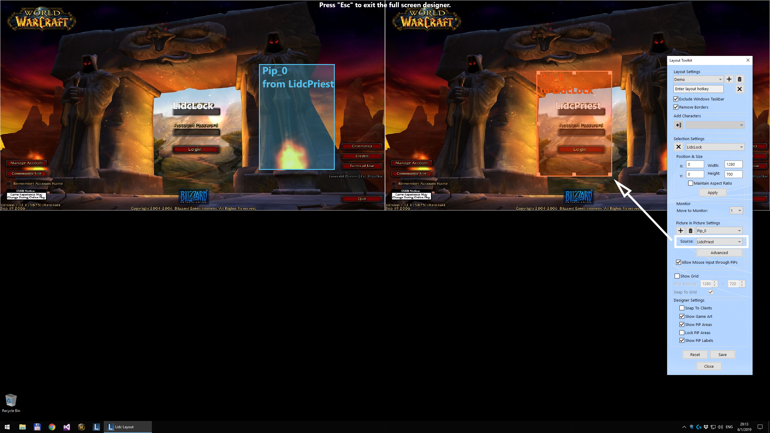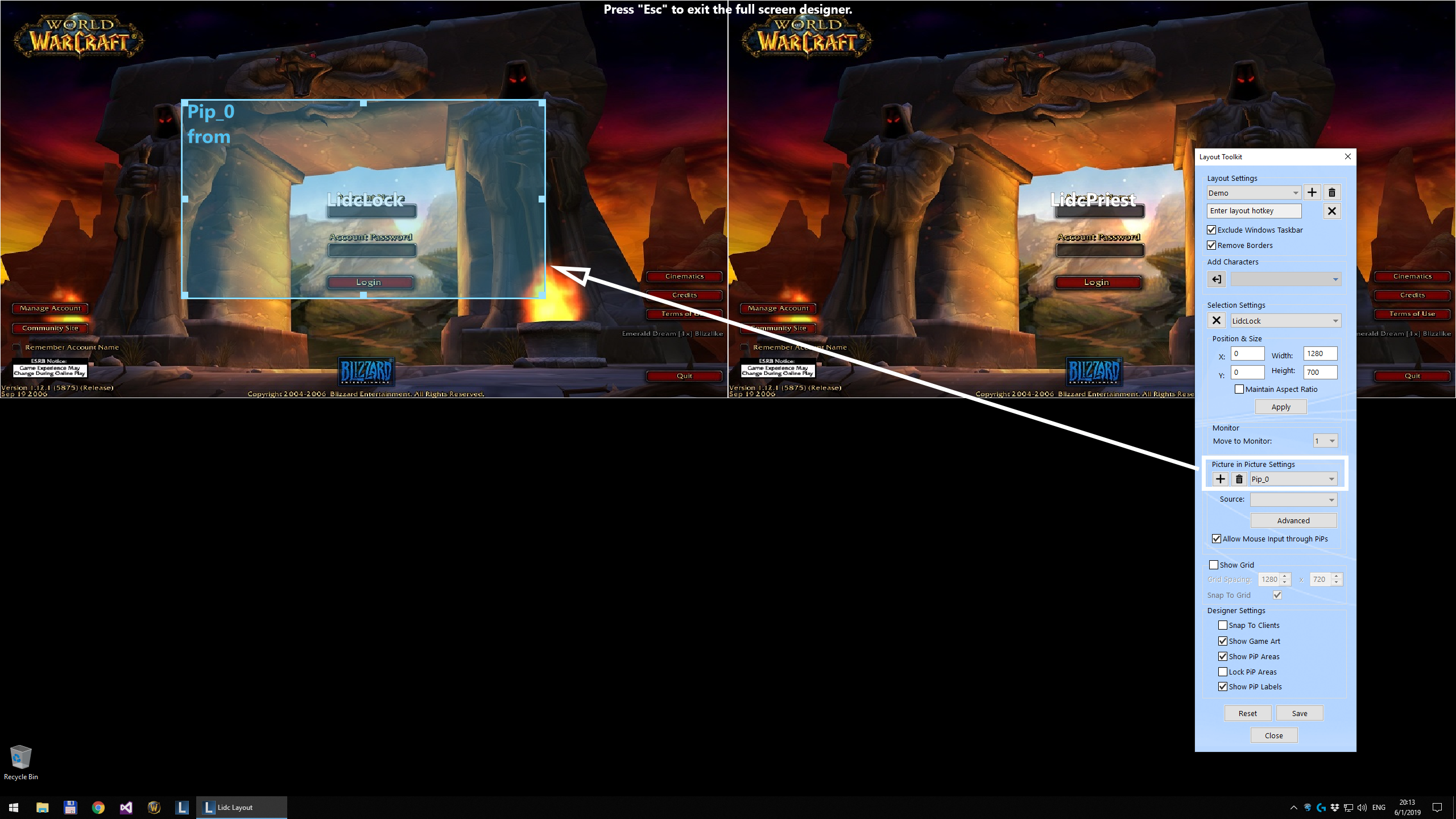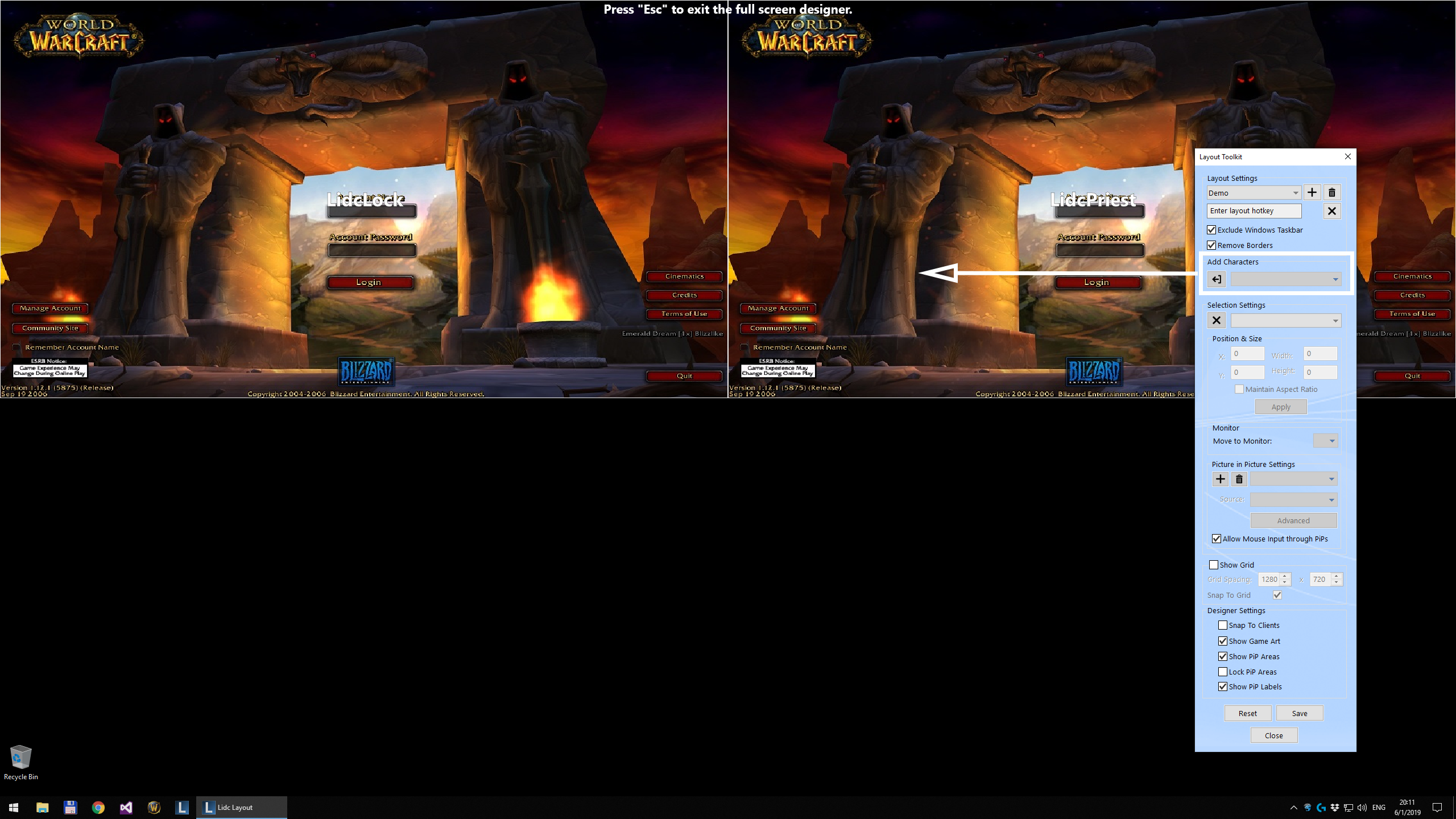 Use the Edit in Full Screen feature to create or modify a layout directly on your screen and view your clients at their real size while designing your layout. Any already running characters will use their live client window instead of the game preview image allowing you to transform your characters in real time.