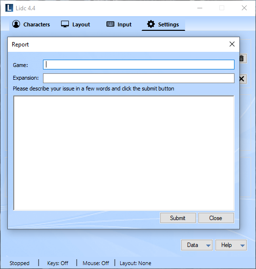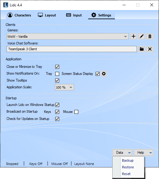 The data menu offers the ability to backup and restore all your data including your Characters, Groups, Layouts, Keys and Hotkeys. Use this functionality to create backups for safekeeping and to transfer your data in case you wish to play on another computer.