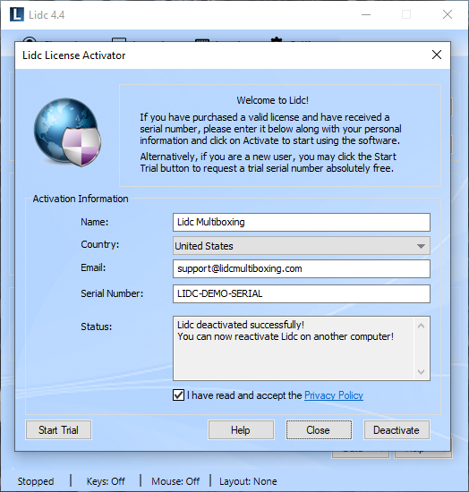If you have any issues with your license, you may attempt to resolve them using our License Issue Resolution Center or by contacting Lidc Support via email to support@lidcmultiboxing.com.