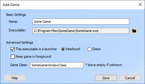 This setting indicates the window class name of the game window, and if provided, it will greatly increase the chances of getting your game recognized by the software during launch. To obtain this information you will need to use a tool that can display window class name information for all windows in your system. Such tools are available as freeware on the internet. If such an endeavor sounds a little bit too technical, please don't hesitate to contact support with your game information and we will do our best to obtain it for you.